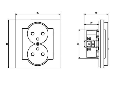 Standardowe gniazdo elektryczne podwójne z bolcem uziemiającym. W zestawie z ramką.