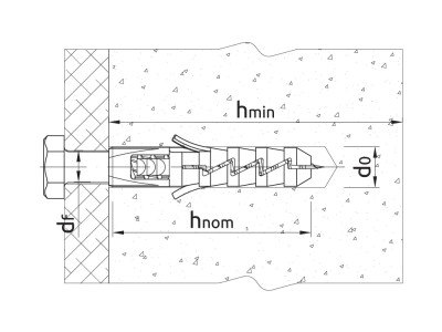 Wywierć otwór odpowiedni dla kołka 12×60 mm, a następnie usuń urobek. Włóż kołek do otworu i dociśnij go, aby wypustki stabilizujące poprawnie go osadziły. Umieść wkręt w mocowanym elemencie i dokręcaj kluczem lub wkrętarką, aż koszulka rozpręży się w dwóch kierunkach, zapewniając trwałe i pewne zamocowanie w podłożu pełnym.
