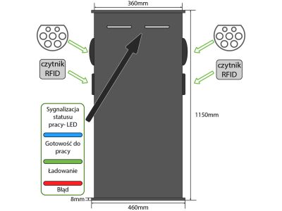 Inteligentny kontroler ładowania: Kontrola ładowania obsługujący komunikację między stacją a podłączonym samochodem. Automatycznie wyłącza proces ładowania w przypadku stanu błędu