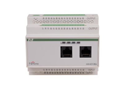 Alternatywny kod produktu: mH-IO12E6 / 5Moduł montowany jest w rozdzielni, zajmuje pole 6 modułów i zasilany jest napięciem 24V. Do wejść modułu przewodami typu UTP sprowadzane są przyciski rozlokowane na budynku. Moduł zarządza załączaniem oświetlenia lub silnikami za pośrednictwem przekaźnikowych modułów wykonawczych typu mH-R8x8, mH-R8/2, mH-RE4 lub mH-R2x16. Sterowanie odbywa się w pełni po linii niskiego napięcia 24V, co zapewnia bezpieczeństwo i możliwość dowolnego rozmieszczenia przycisków sterujących w budynku. Moduł mH-IO12E6 komunikuje się z panelami dotykowymi poprzez magistralę CAN. Dowolne wyjście modułu może być wyzwolone z poziomu paneli dotykowych poprzez wybranie konkretnego urządzenia lub sceny (grupy urządzeń). Z poziomu panelu dotykowego istnieje możliwość zaprogramowania czasowego samoczynnego załączania/wyłączania urządzeń lub grup urządzeń sterowanych z modułu wejść/wyjść.