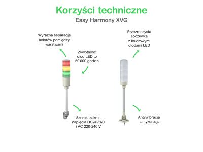 Produkt ten jest częścią gamy Easy Harmony XVG, oferty monolitycznych kolumn świetlnych Ø 60mm. Jest to kompletna, wstępnie okablowana i zmontowana monolityczna kolumna świetlna. Wyposażona jest w czerwone, bursztynowe, zielone i niebieskie światło stałe. Oferuje konfigurowalne kombinacje kolorów. Ta kolumna świetlna ma 24V AC / DC napięcia znamionowego. Stałe schematy oświetlenia umożliwiają ciągłe alarmowanie o stanie maszyny personelu hali produkcyjnej wokół maszyny. Ma aluminiową rurę i waży 0,53kg Jest to produkt o stopniu ochrony IP53 i posiada certyfikaty CE i EAC. Posiada montaż na podstawie i wstępnie zmontowany kabel dla łatwej instalacji. Zapewnia bardziej niezawodny i wyraźny widok dzięki przezroczystej soczewce. Ta gama oferuje szeroki wybór napięcia i elastyczne opcje montażu z funkcjami wizualnymi i dźwiękowymi.