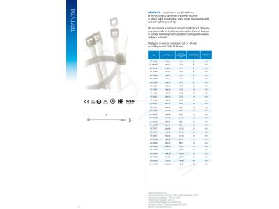 TRYTYTKI GT – standardowe opaski zaciskowe przeznaczone do łączenia przewodów, węży, rurek, mocowania tabliczek identyfikacyjnych i nie tylko. Wykonane z poliamidu 6.6 (wolnego od związku fosforu i kadmu). Zalecane stosowanie wewnątrz pomieszczeń. Użycie tego rodzaju opasek zaciskowych nie wymaga stosowania żadnych narzędzi! W naszej ofercie dostępne w wersji o szerokości od 1,7 – 9 mm oraz długości od 75 do 1170 mm.
