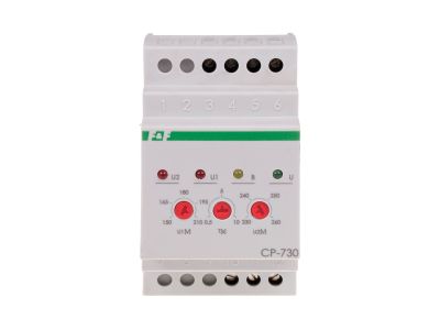 Przekaźnik napięciowy CP-730 służy do kontroli napięcia sieci trójfazowej i zabezpieczenia odbiornika jednofazowego przed skutkami wzrostu lub spadku napięcia poza ustawione wartości.