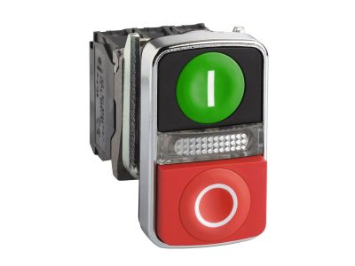Podświetlany, podwójny przycisk Schneider Electric Harmony XB4 ma 1 zielony i 1 czerwony przycisk i 1 centralną białą lampkę kontrolną, działa z mechanizmem powrotu/impulsu sprężyny i wykorzystuje zaciski śrubowe. Ma 1 x styk NO + 1 x NC i chromowaną metalową ramkę. Jest oznaczony symbolami „I” i „O”.