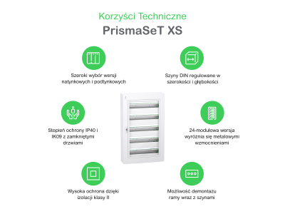 Montowana podtynkowo obudowa PrismaSeT XS. Ta obudowa z tworzywa sztucznego składa się z 2 rzędów po 18 modułów 18 mm. Jest przystosowana do wszystkich typów rozdzielnic modułowych. Obudowa dedykowana jest do montażu wewnątrz pomieszczeń. Stopień ochrony IP to drzwi zamknięte IP40. Jest wyposażona w zwykłe drzwi. Kolor obudowy, płyty czołowej i drzwi jest biały (RAL 9003). Gotowa do użycia, jest przeznaczona do użytku w sektorach mieszkalnych i usługowych. Opracowana dla elektryków, zapewniając ergonomię i elastyczność instalacji. Kable mogą być wprowadzane przez górną lub dolną część obudowy za pomocą zdejmowanych płyt wprowadzeniowych. Umożliwia wprowadzenie kabli lub rury. Wyposażona jest w 1 płytę tylną i 2 szyny DIN. Szyny są zdejmowane i ułatwiają okablowanie i konserwację. Jest wyposażona w 1 uziemienie i 1 neutralny blok zacisków. Blok zacisków uziemiających zapewnia 22 wyjścia (11x16mm² + 11x10mm²). Neutralny blok zacisków zapewnia 16 wyjść (2x(4x16mm² + 4x10mm²)). Wyposażowna w 2 etykiety identyfikacyjne, 2 ochraniacze etykiet, 1 płytkę zaślepiającą i osprzęt do mocowania okablowania. Klasa izolacji elektrycznej to Klasa II. Napięcie izolacji znamionowej Ui wynosi 400V. Kategoria przepięciowa to II. Prąd znamionowy ln wynosi do 90A. Straty mocy wynoszą 62W. Zgodna z normami IEC 60670-1 i 24, IEC 61439-1 i 3. Całkowite wymiary to (szer.) 486mm x (wys.) 510mm x (gł.) 129mm. Waga wynosi 4,280 kg. Obudowa i osłona przednia wykonane są z technoplastiku. Tylna część i drzwi wykonane są z technoplastiku. Odporność tworzywa sztucznego na płomienie i nienormalne ciepło wynosi 650°C dla obudowy, osłony przedniej, płyty tylnej i drzwi. Stopień ochrony IK to IK09 z zamkniętymi drzwiami. Temperatura pracy wynosi od -25°C do 60°C.