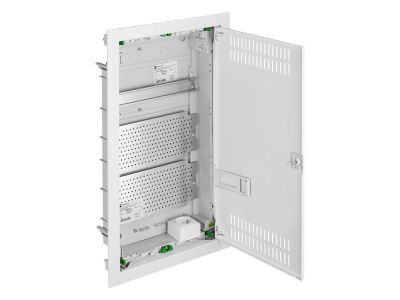 Zawiera zestaw do uniwersalnego montażu w ścianie m.in. łapy metalowe do muru, spinkę do łączenia rozdzielnic w pionie i poziomie. Gniazdo n/t 2P+Z. Szynę TS 35 – 1 szt. Płytę montażową z otworami do zamocowania urządzeń tele-informatycznych – 2 szt. Drzwi stalowe super płaskie tylko 5mm grubości.Wymiary zewnętrzne: 358 x 603 x 94 mm.