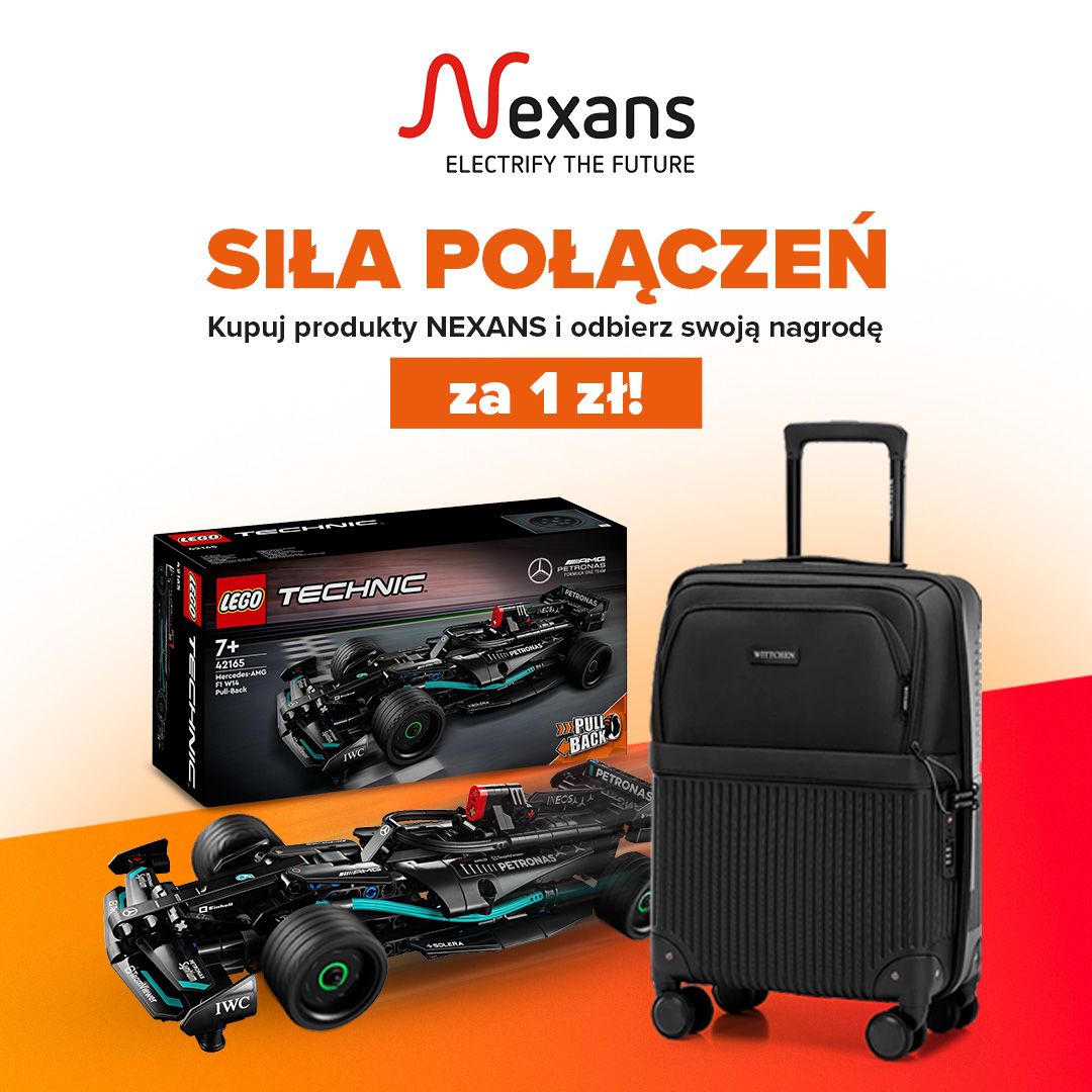 Tylko teraz za zakup produktów marki Nexans możesz otrzymać walizkę kabinową Wittchen lub zestaw Lego Technic Mercedes AMG F1 idealne na prezent za jedyne 1 zł!