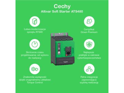Softstart Altivar ATS480 przeznaczony jest do uruchamiania i zatrzymywania silników asynchronicznych zasilanych napięciem od 208V do 690V. Spełnia wymagania najbardziej wymagających zastosowań w normalnych i ciężkich warunkach pracy. Z operacyjnym prądem znamionowym 140A w normalnym trybie pracy, zasila silnik od 37kW do 110kW w zależności od napięcia sieciowego. Zaprojektowany dla cyfryzacji, podłączony, zoptymalizowany pod kątem spełnienia standardu cyberbezpieczeństwa, upraszcza realizację projektów i maksymalizuje dostępność aplikacji. Układ sterowania momentem obrotowym (TCS) umożliwia przyspieszanie i zwalnianie. Skutecznie zatrzymuje aplikację o dużej bezwładności dzięki dynamicznemu hamowaniu i zastrzykowi prądu stałego. Można go podłączyć w linii lub wewnątrz trójkąta, aby zmniejszyć jego prąd roboczy. Wbudowana procedura testowa upraszcza uruchomienie wewnątrz trójkąta. Jego wymiary to 200mm (szerokość) x 272mm (głębokość) x 340mm (wysokość), a waga wynosi 12,4kg.Softstart Altivar ATS480 został zaprojektowany z myślą o procesach, infrastrukturze i maszynach przemysłowych. Spełnia wymagania normy IEC/EN60947-4-1. Posiada certyfikaty CE, cULus, UKCA, CCC, RCM, EAC oraz certyfikaty morskie DNV, ABS, BV i CCS. Terminale wyświetlaczy, zestaw do zdalnego montażu, moduły komunikacyjne są wspólne z Altivar Drives. Dławiki liniowe, zestawy DNV są wspólne z ATS48.ATS480 jest kompatybilny z ATS48, ma taką samą powierzchnię podstawy, mocowanie, algorytm kontroli momentu obrotowego, I/O, menu... Integracja Softstartu Altivar ATS480 w EcoStruxure drastycznie upraszcza wybór architektury, projekt wykonawczy i realizację w systemach automatyki i elektrycznych. Jest to produkt klasy Green Premium, zaprojektowany tak, aby względy środowiskowe wykraczały poza obecne dyrektywy i przepisy, zgodny z RoHS i REACH.