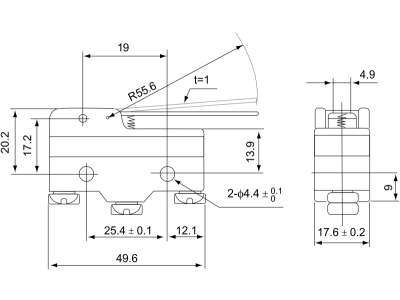 Wyłącznik krańcowy, z dźwignią sprężynową 1×CO, 15A/250V AC, 49mm, IP00