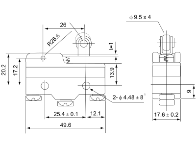 Wyłącznik krańcowy, z dźwignią sprężynową i rolką 1×CO, 15A/250V AC, 26mm, IP00