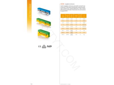 Zaciski rozgałęźne izolowane przewodów zerowych oraz ochronnych, wykonane są z bezhalogenowego poliamidowego wspornika, w którym osadzony jest izolowany mosiężny zacisk. Mocowanie żył przewodu za pomocą stalowych śrub M5 (max. moment dokręcenia 1,5Nm). Zacisk jednostronnie zamknięty. Przeznaczone do zamocowanie na szynie TH-35