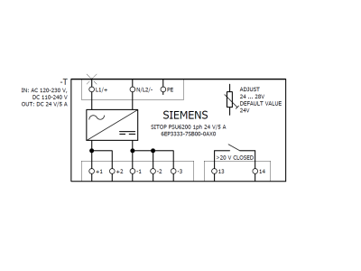 SITOP PSU6200 24 V/5 A Stabilized power supply Input: 120 - 230 V AC, (120 - 240 V DC) Output: 24 V DC/5 A The 1-phase SITOP PSU6200 are technology power supplies for demanding solutions and offer maximum functionality for use in complex plants and machines. The wide range input supports connection to each network worldwide and ensures security even during large fluctuations in voltage. The Extra-Power supplies up to 150% of the rated current for short periods of time. In case of an overload, the PSU6200 supplies a constant current up to a voltage of 15 V DC. The very high efficiency keeps the energy consumption and the heat development in the control cabinet at low levels and the entire metal enclosure is also space-saving. To further increase 24 V availability, the SITOP PSU6200 power supplies can be combined with buffer, DC UPS, redundancy and selectivity modules. Regardless of the industry, regardless of the requirement – Siemens offers reliable and efficient power supplies for any plant.