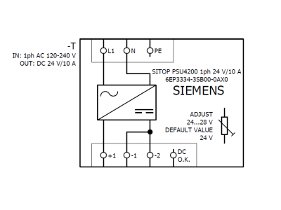 SITOP PSU4200 1AC 24 V/10 A stabilized power supply PSU4200 input: 120/240 V AC output: 24 V DC/ 10 A The 1-phase power supplies SITOP PSU4200 are designed for basic requirements in the industrial environment and offer all important functions at a low price. The input with automatic voltage range switching enables connection to a wide variety of 1-phase supply networks. Due to the narrow width, the power supply units require little space on the DIN rail and the high level of efficiency means that little heat is lost in the control cabinet. To further increase the 24 V availability, the SITOP PSU4200 power supplies can be combined with buffer, redundancy and selectivity modules. No matter what industry, no matter what requirement – Siemens offers reliable and efficient power supplies for every system.