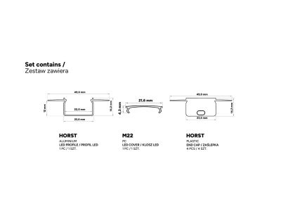Zestaw zawiera: 1 x Profil LED HORST, 1 x Klosz LED M22, 4 x Zaślepka HORST